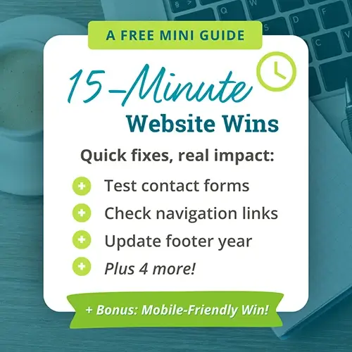 If you’ve been putting off updates because they feel too time-consuming or intimidating, start here. Grab my free 15-Minute Website Wins guide and knock out a few quick fixes that build momentum, boost your confidence, and help you remember your site can work for you.